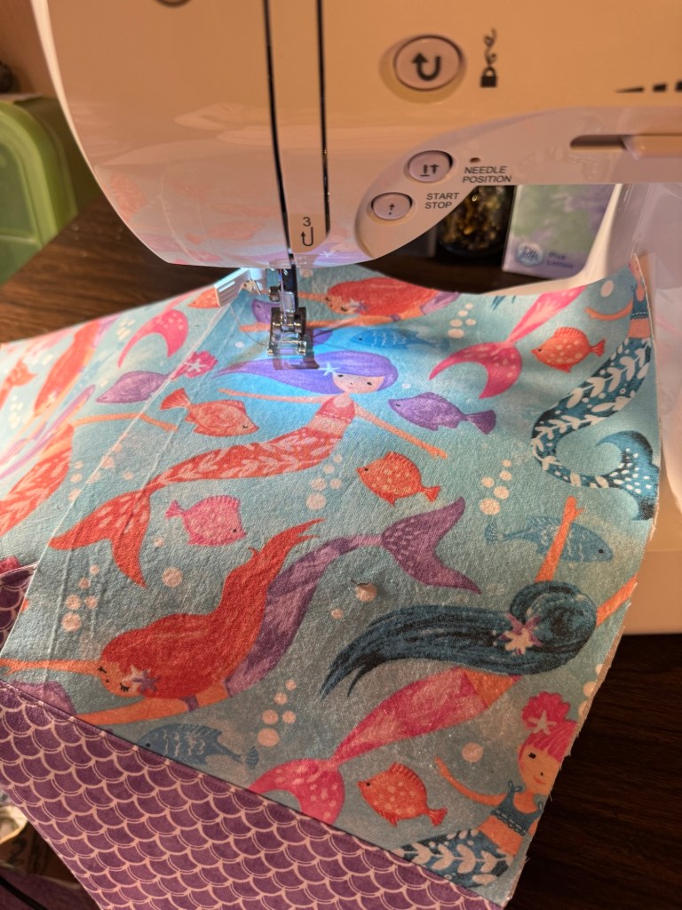 Thankfully, I once again had my sidekick and sewing expert (my sister) who just happened to have MERMAID fabric in her stash. She also suggested – wisely – that I consider a breakaway clasp for safety.