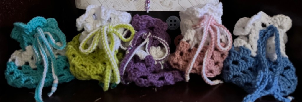 The bags make unique gift holders, are ideal for carrying small things that we don’t want to be floating around loose in our purse or tote, and as I noted in my previous post, they’re fun to make! They are also PERFECT for turning stash yarn into something creative and cute.